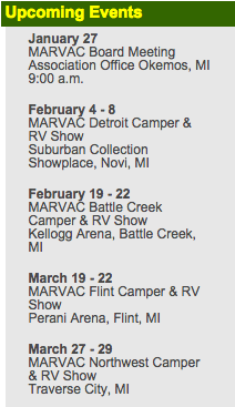 The annual “boat” load of RV shows are just around the corner! Beginning in mid-January MARVAC will be distributing the annual MARVAC RV & Campsite Directory along with MARVAC member’s campground brochures at RV shows across the state. The first show will be in Grand Rapids beginning January 15th. If you need to replace out dated brochures, please send us a new supply. If you have been diligent in sending us a good supply of brochures over the past twelve months, we probably have enough. In any case, feel free to contact Darren Ing or Bill Sheffer at the association office and we can check for you! Enjoy the holidays and let’s get ready for a great 2015 of camping!