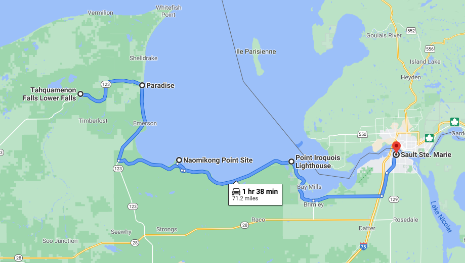 Backtrack to Paradise, a small town with a big, industrious past. Paradise serves as a base for many outdoor enthusiasts and travelers of all kinds to many popular attractions and trails. It’s also home to the Annual Wild Blueberry Festival every summer. Just south of Paradise is where you’ll pick up Lake Superior Shoreline Road.
