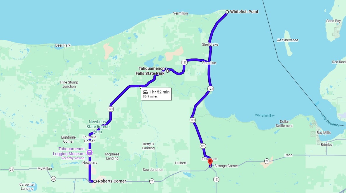 The Tahquamenon Falls Scenic Byway (M-123) is 63 miles long across part of the Eastern Upper Peninsula. The byway starts and ends at M-28, heading north, then across to the east to the Lake Superior shoreline, then back south to the M-28 highway. Most folks begin their exploration in the town of Newberry.  It can all be driven in a day, but you’ll want to take your time at several of the stops, which is why we stretched out this itinerary to encompass three days. Choose a place to camp and then hit the road!